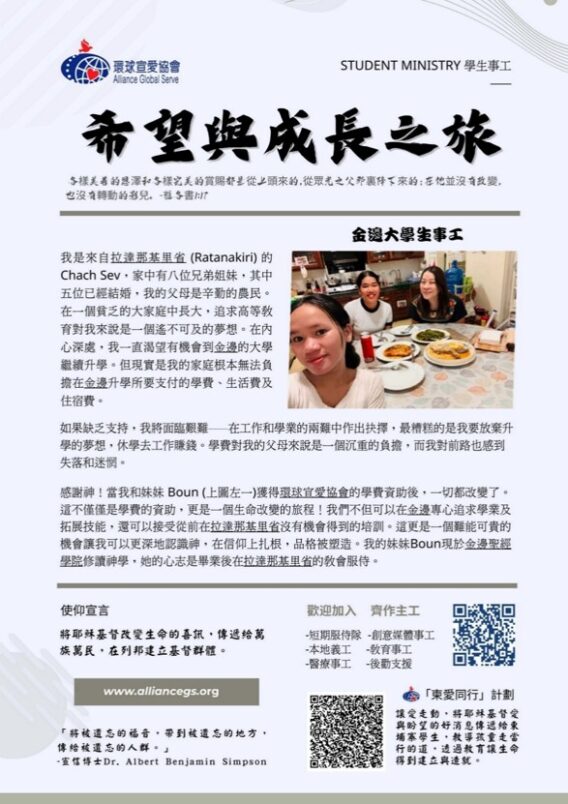 此與同時、協會正努力為「珠山耀愛中學」的學校營運與教育經費籌款,希望教會、弟兄姊妹與各界人士能參與《柬愛同行》計劃,成為學生同行者,資助他們的年度教育經費,讓學生得著教育機會和身、心、社、靈的全人發展,成就辦學傳福音和差傳大使命。