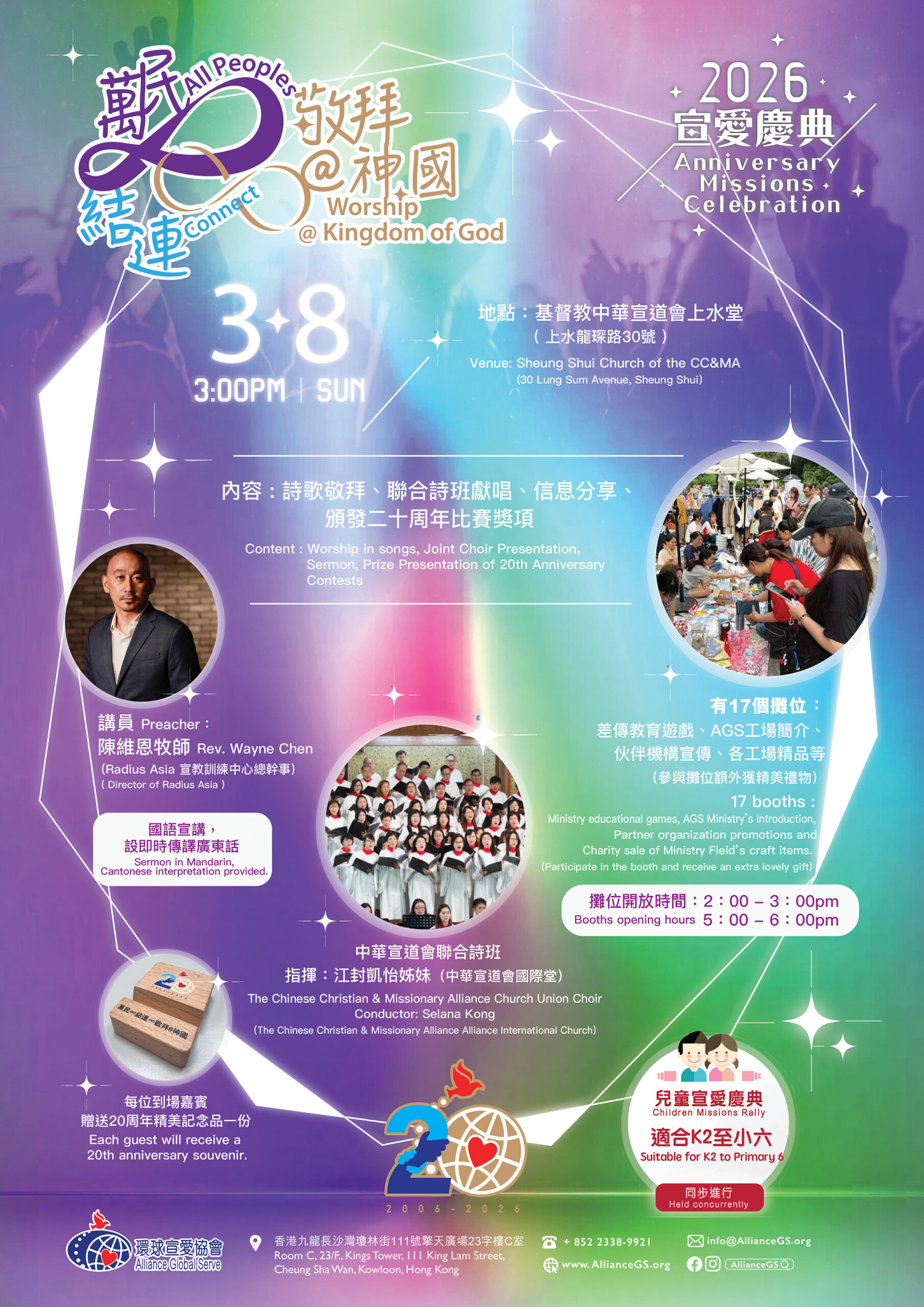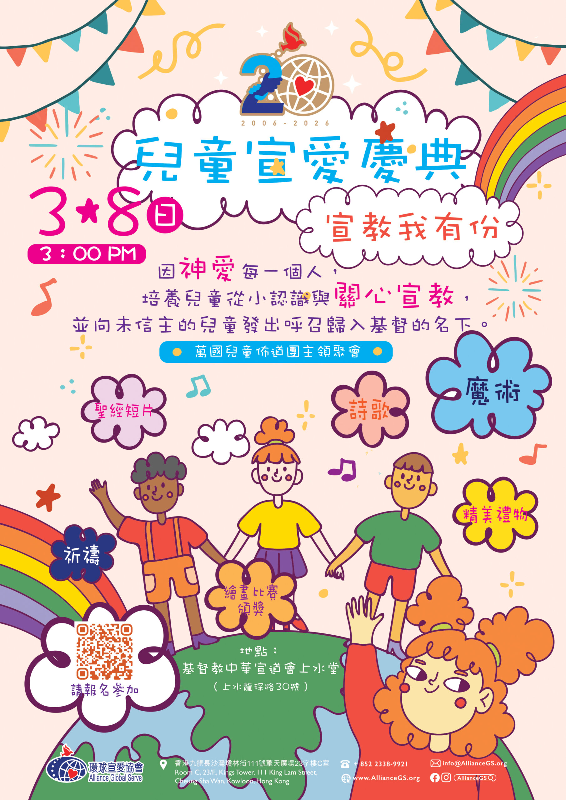 環球宣愛協會即將迎接二十周年,我們繼續秉持使命宣言「將耶穌基督改變生命的喜訊,傳遞給萬族萬民,在列邦建立基督群體。」我們將以 「萬民∞結連∞敬拜@神國」 為二十周年主題。詩篇96:1-4(和修版)「你們要向耶和華唱新歌!全地都要向耶和華歌唱!要向耶和華歌唱,稱頌他的名!天天傳揚他的救恩!在列國中述說他的榮耀!在萬民中述說他的奇事!因耶和華本為大,當受極大的讚美;他在萬神之上,當受敬畏。因萬民的神明都屬虛無;惟獨耶和華創造諸天。有尊榮和威嚴在他面前,有能力與華美在他聖所。」