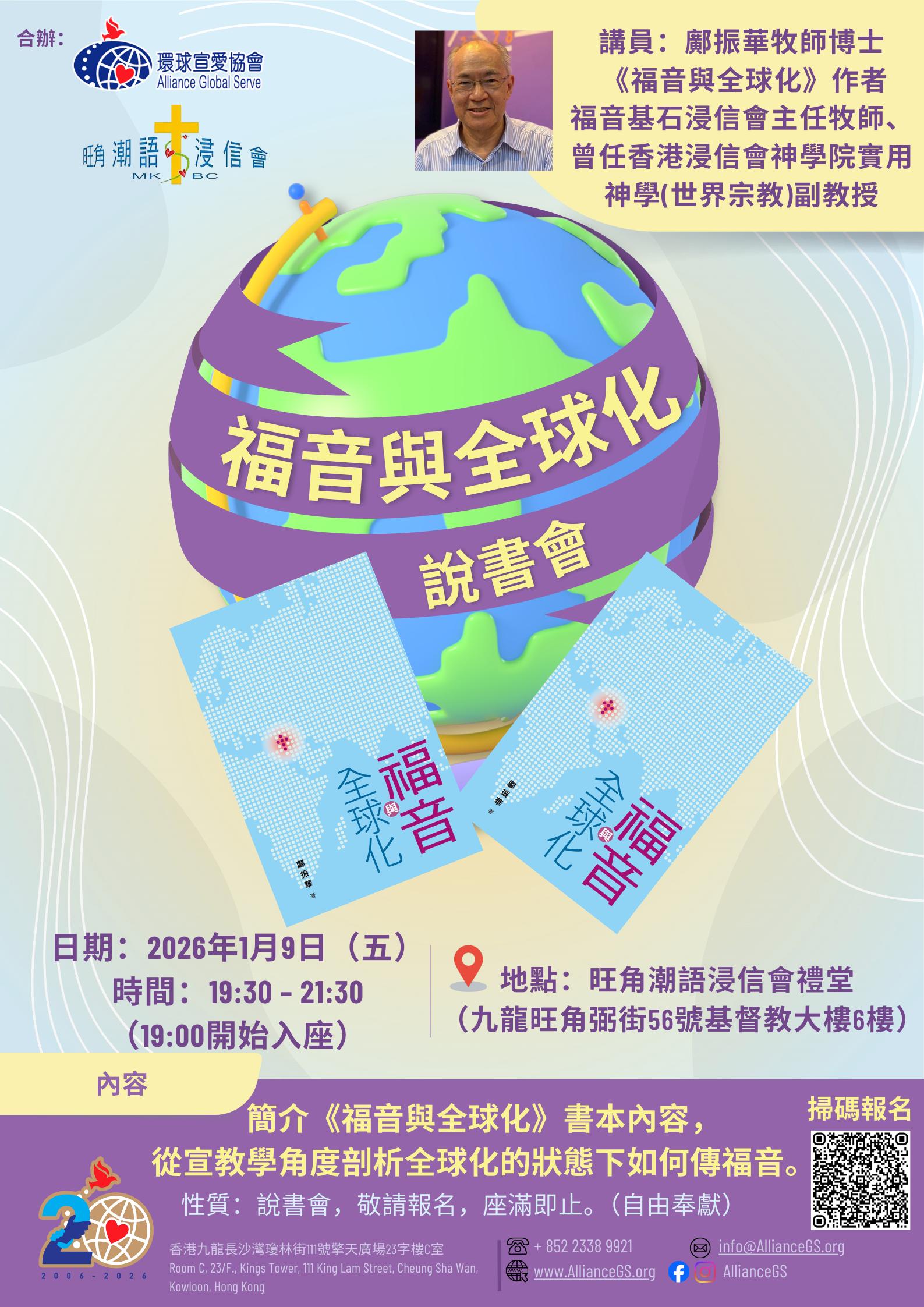 講員: 鄺振華牧師博士《福音與全球化》作者 福音基石浸信會主任牧師、曾任香港浸信會神學院實用神學(世界宗教)副教授