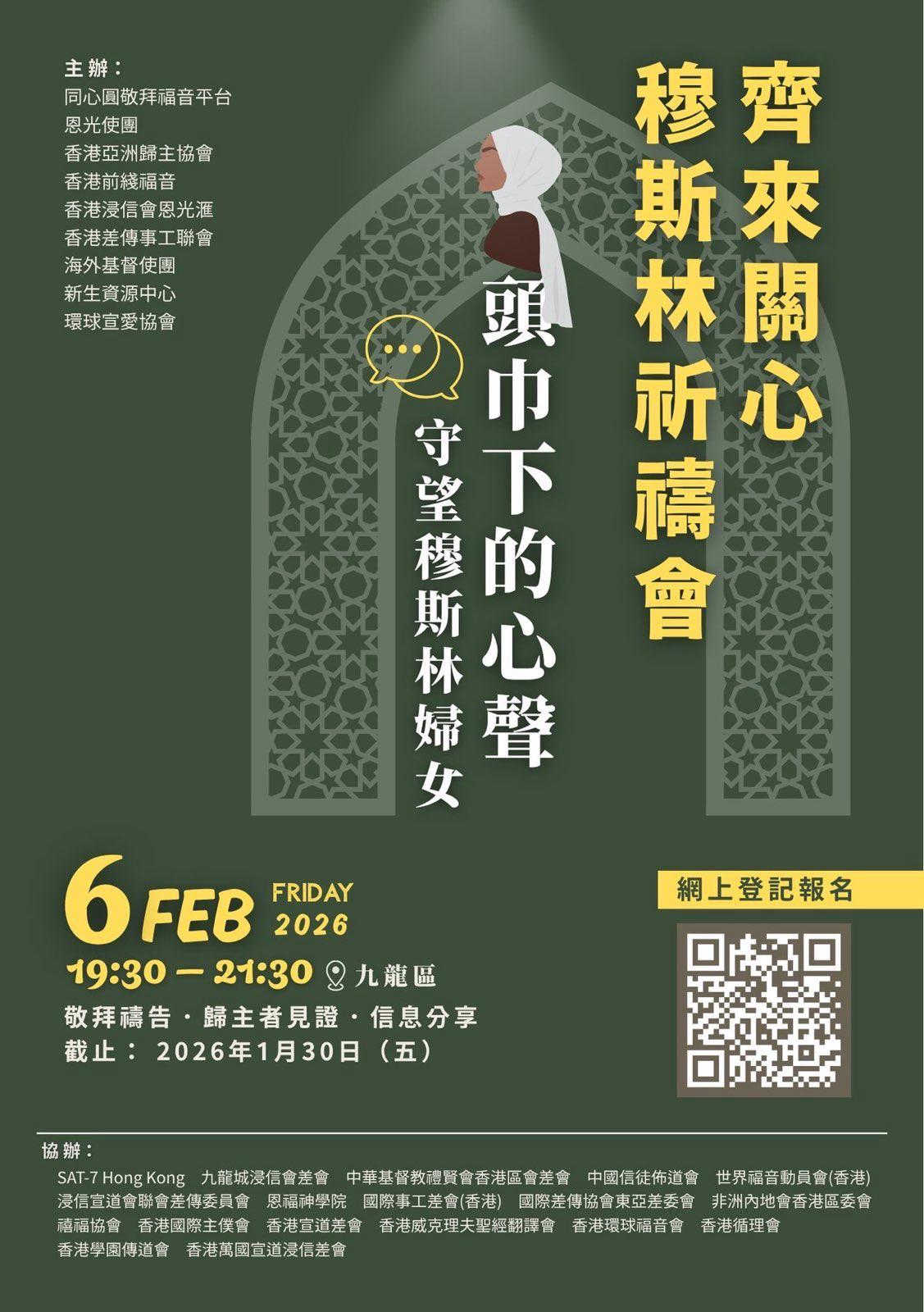 2026-齊來關心穆斯林祈禱會 截止報名日期:: 2026年1月30日 (星期五) 日期: 2026年2月06日 (星期五) 時間: 2:30 pm – 4:30 pm 請即報名 Date 2026年 2 月 06日 週五 - 2026年 3 月 06日 週五 Expired! Time 19:30 - 21:30 Category 活動