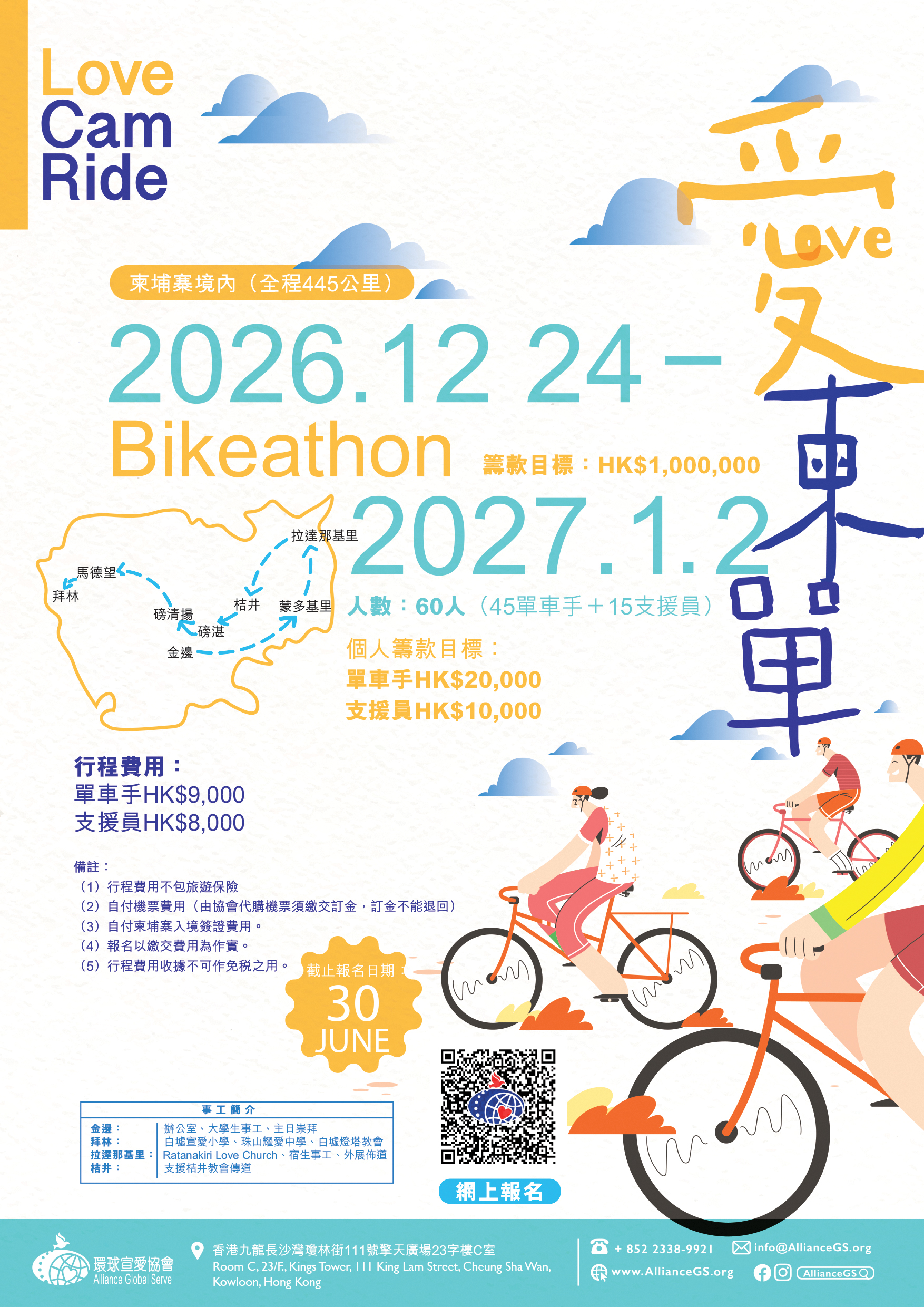 - 自付機票費用(由協會代購機票須繳交訂金HK$4,000,訂金不能退回),若自行訂機票,請於12月24日早上10:15到達金邊德崇國際機場(KTI)