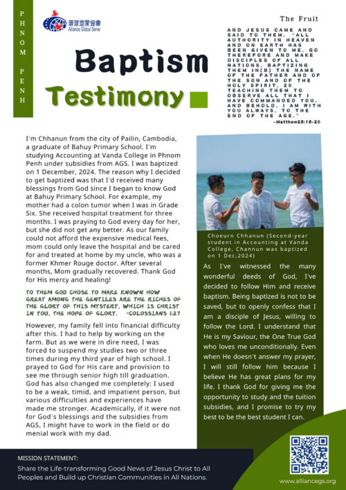 Since we began ministering to university students in Phnom Penh in 2018, we are now tasting some encouraging results. Three graduates from the Pailin Bahuy AGS Primary School have returned to Pailin after their University graduation to serve at the Bright Pailin School, taking on roles in administration and education. On the church development side, the Pailin Bahuy Lighthouse Church has been established for over two years. In 2023, four new believers were baptized and joined the church, with an average attendance of forty people at various church activities.