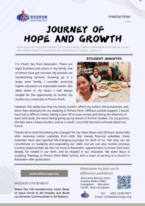 Cambodia is a rebuilding country after the war. Over ninety-five percent of its population practices Buddhism, the state religion, creating a significant need for the gospel. Under the Khmer Rouge regime in the 1970s, nearly all young people and intellectuals had vanished, causing indelible pain for Cambodians. Alliance Global Serve (AGS) has been involved in various life reconstruction projects for years in both urban and rural areas of Cambodia, including establishing churches to care for communities and building schools to nurture children.